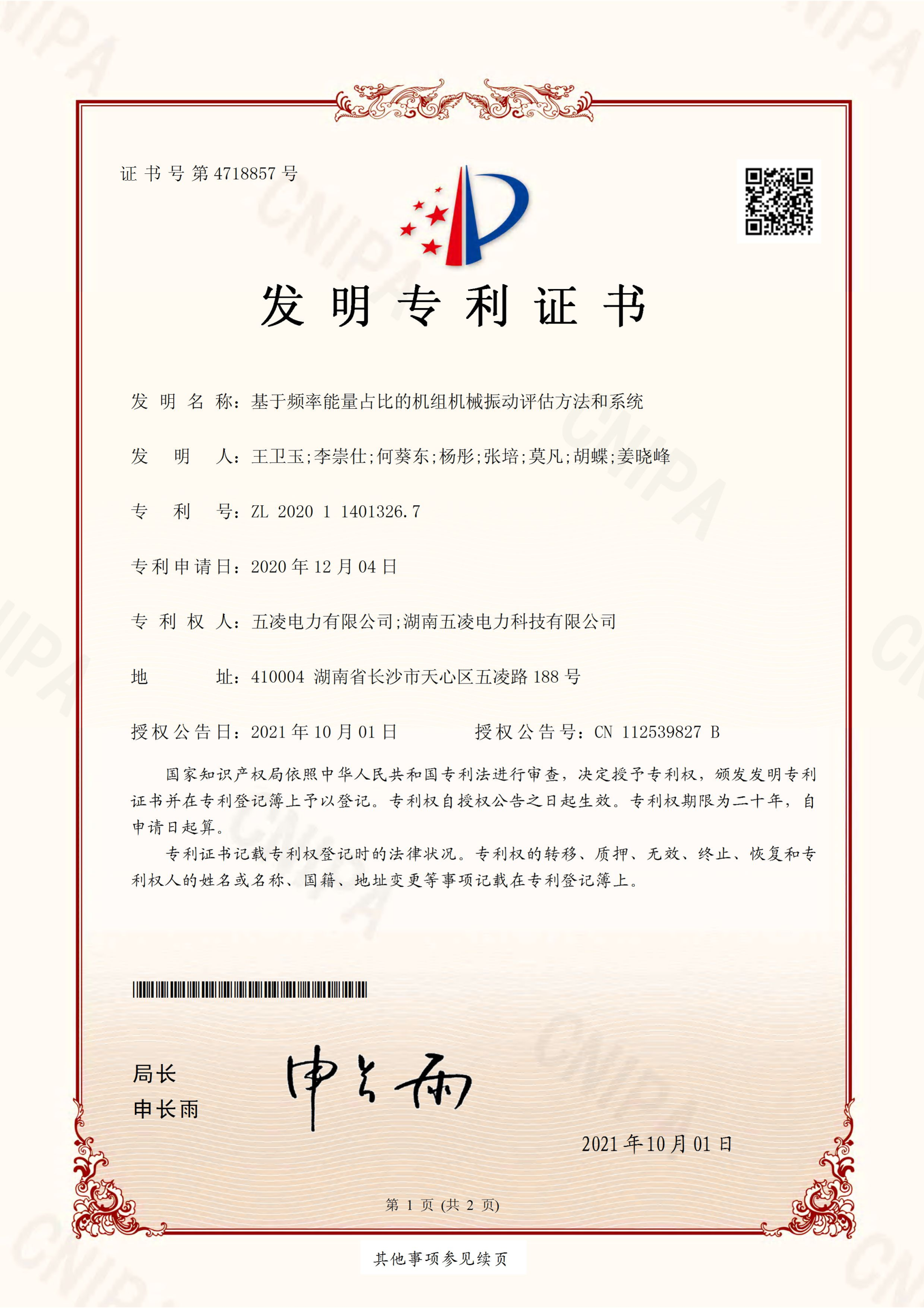 202011401326.7基于頻率能量占比的(de)機組機械振動評估方法和(hé)系統NI201104CN發明專利證書(簽章(zhāng))_1