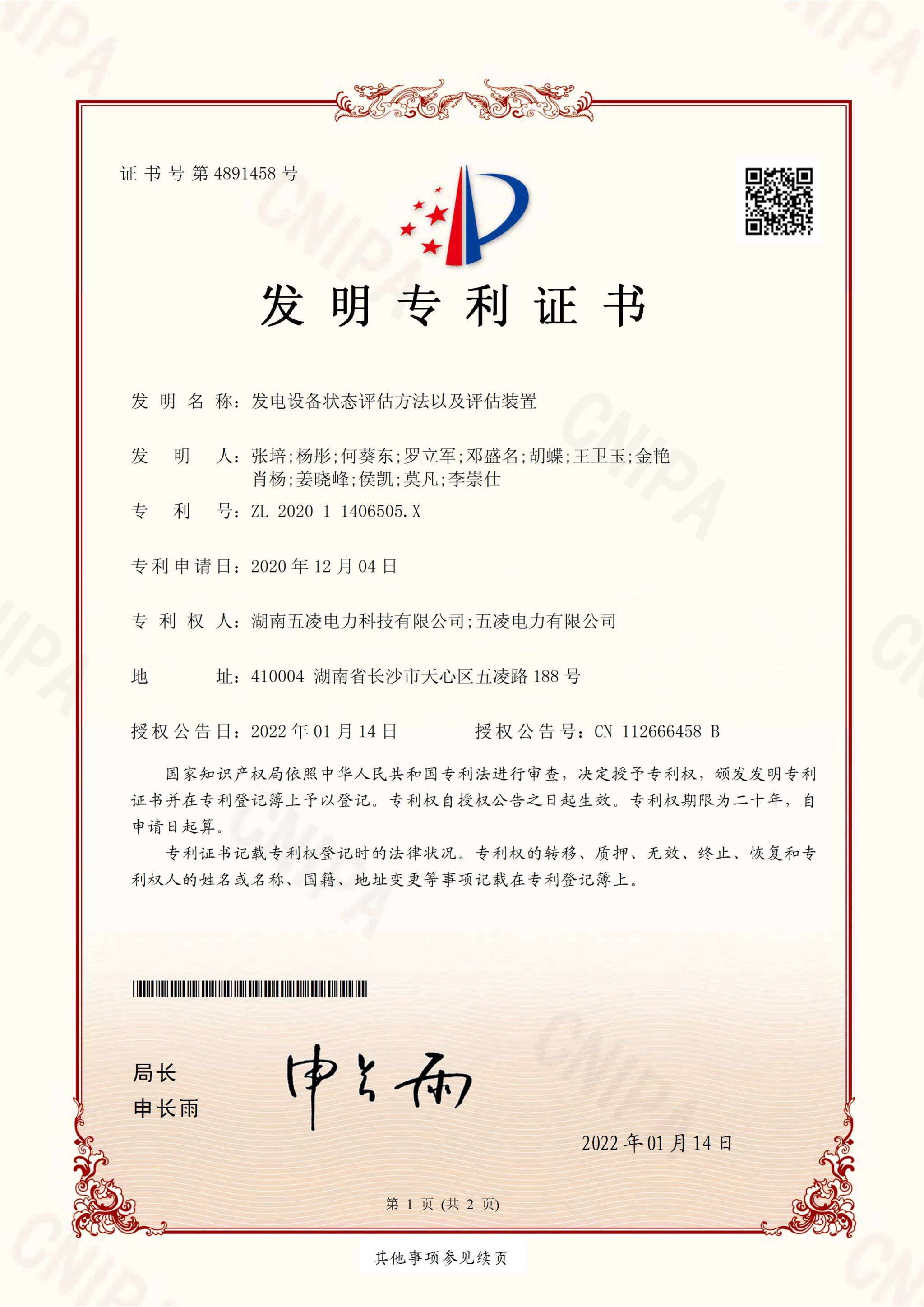 202011406505.X發電設備狀态評估方法以及評估裝置NI200735CN發明發明專利證書(簽章(zhāng))_1