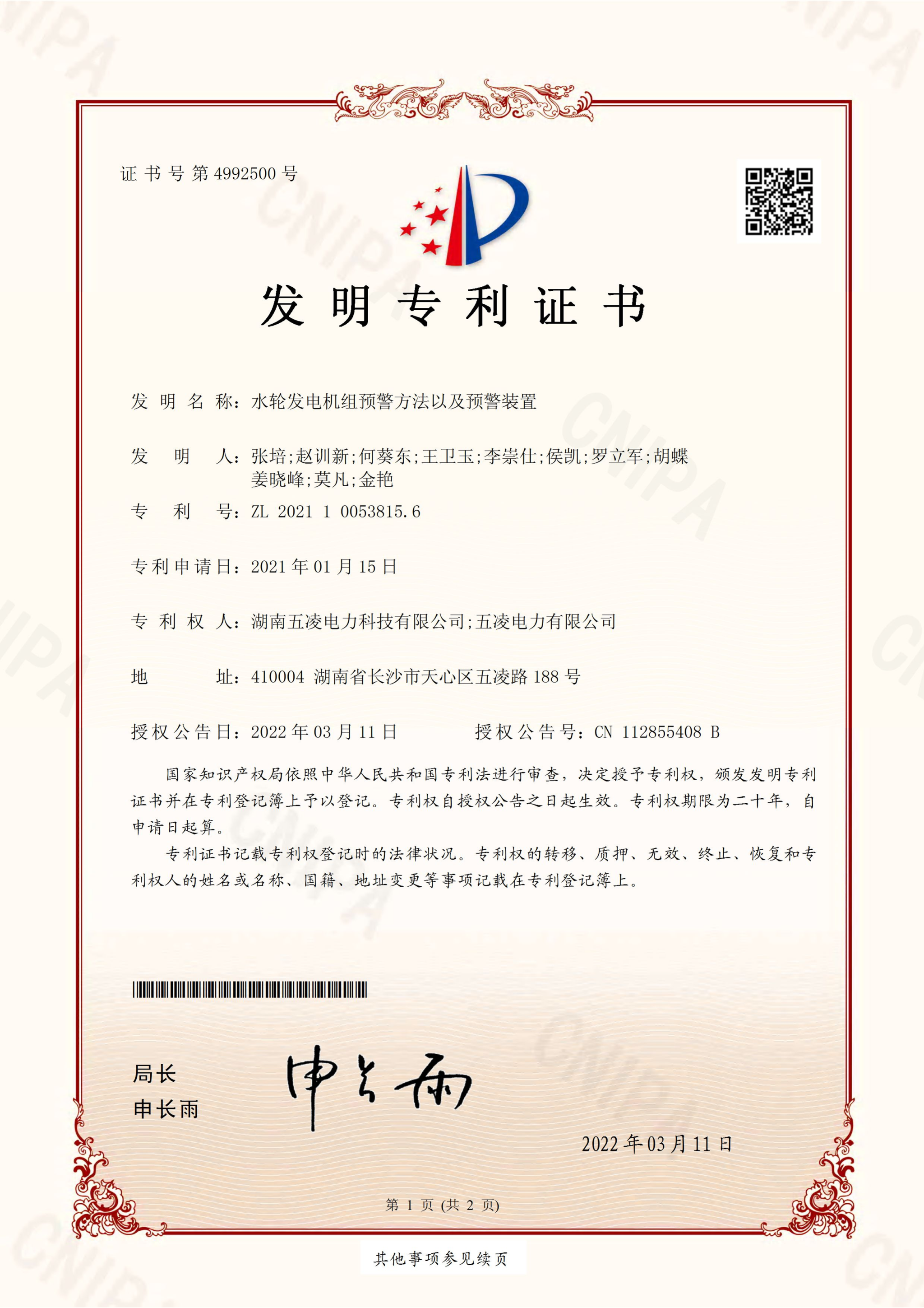 202110053815.6嘉興恒創電力集團有限公司五淩電力有限公司2021100538156水輪發電機組預警方法以及預警裝置發明專利證書_1
