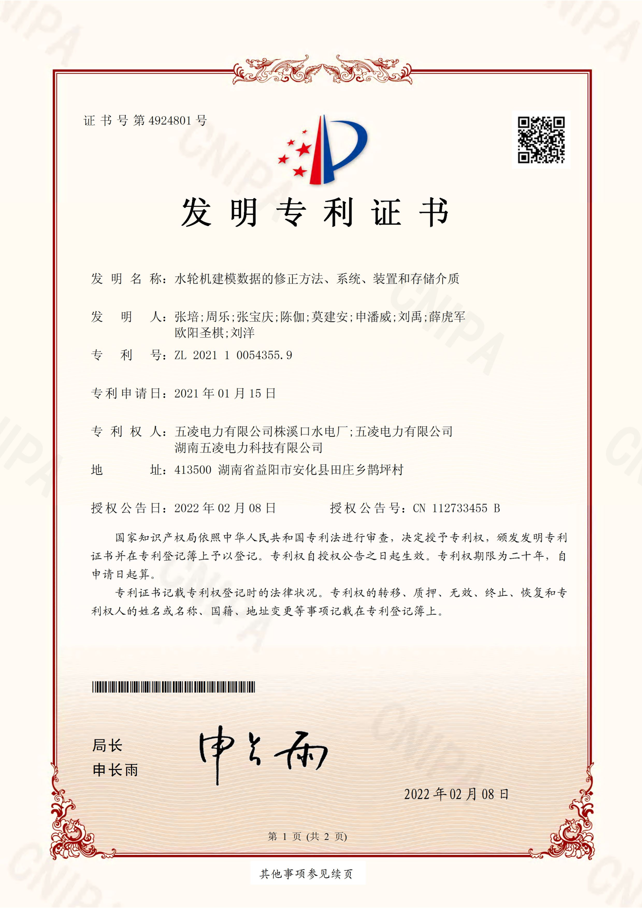 202110054355.9水輪機建模數據的(de)修正方法系統裝置和(hé)存儲介質NI200618CN發明發明專利證書(簽章(zhāng))_1