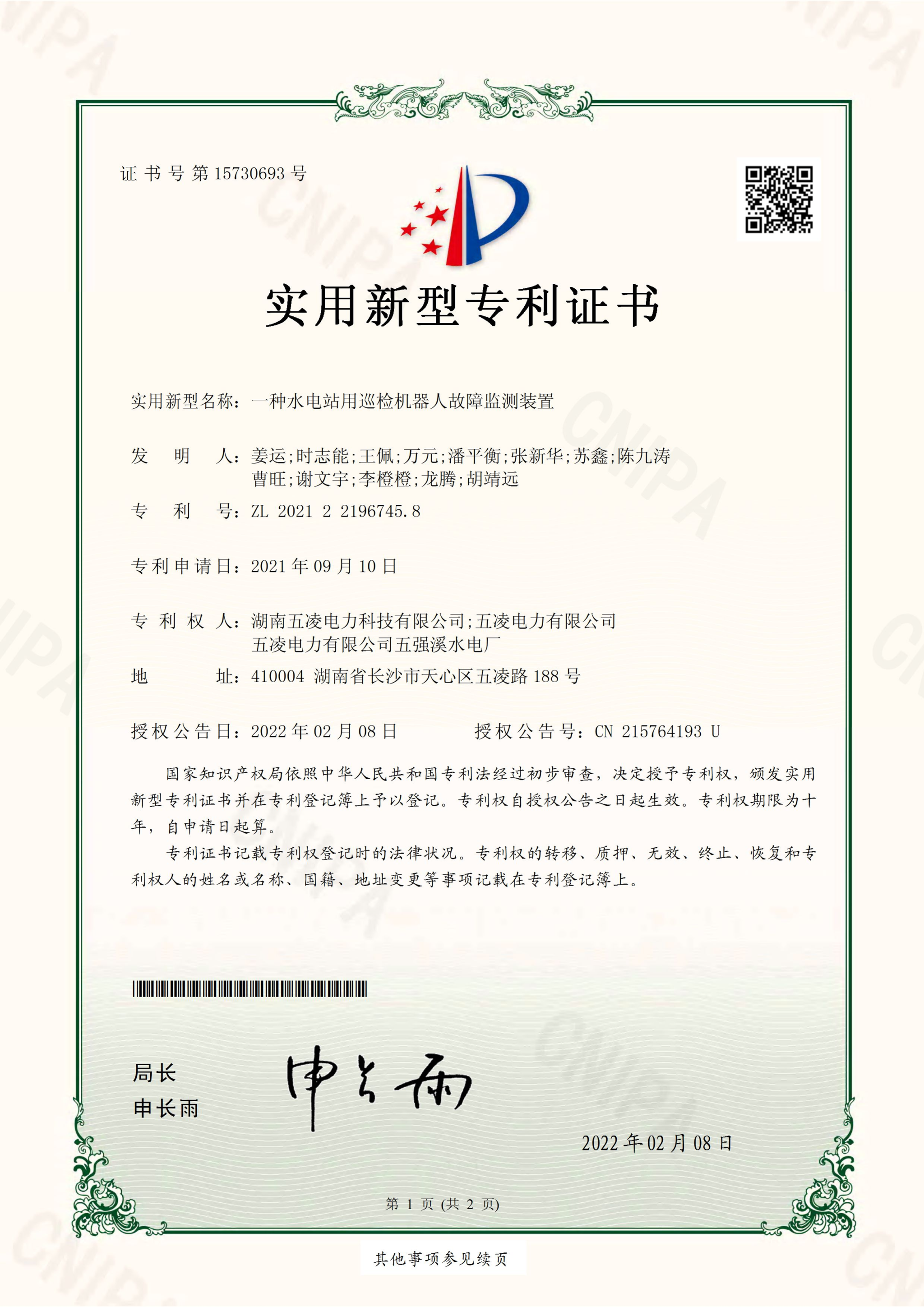 202122196745.8嘉興恒創電力集團有限公司五淩電力有限公司五淩電力有限公司五強溪水電廠一(yī)種水電站用巡檢機器人故障監測裝置2021221967458實用新型專利證書(簽章(zhāng))_1